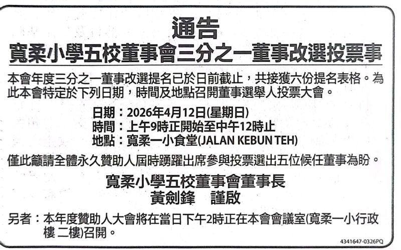 * 日期: 2026年4月12日 (星期日) * 时间: 上午9时正开始至中午12时止 * 地点: 宽柔一小食堂 (JALAN KEBUN TEH)